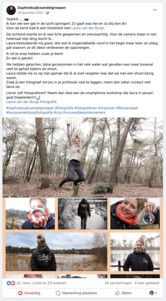 “Laura stelde mij zo op mijn gemak dat ik al snel vergeten was dat we met een shoot bezig waren. We hebben gelachen, en veel lol gehad tijdens de shoot.”